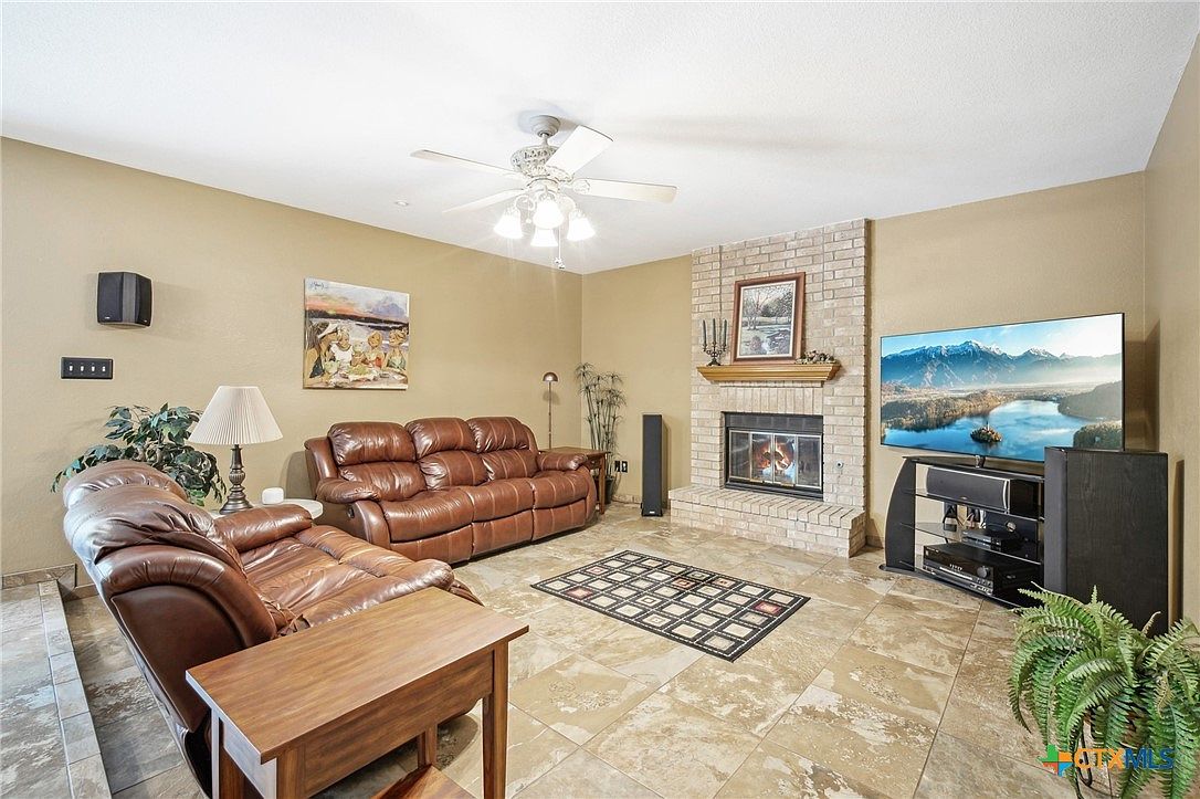 This living room features a warm, inviting atmosphere with earth-toned tile flooring and beige walls that create a cozy backdrop. The focal point is a brick fireplace with a wooden mantel displaying a framed artwork and candle holders, adding rustic charm. Two brown leather reclining sofas provide comfortable seating arranged along two walls, complemented by a simple wooden side table and a classic pleated lamp. A flat-screen TV rests on a sleek black glass stand in the corner, paired with tall speakers for an enhanced entertainment experience. A patterned area rug anchors the seating, while greenery adds natural freshness to the space. The ceiling fan with lights brightens the room and offers air circulation, integrating practicality and comfort.