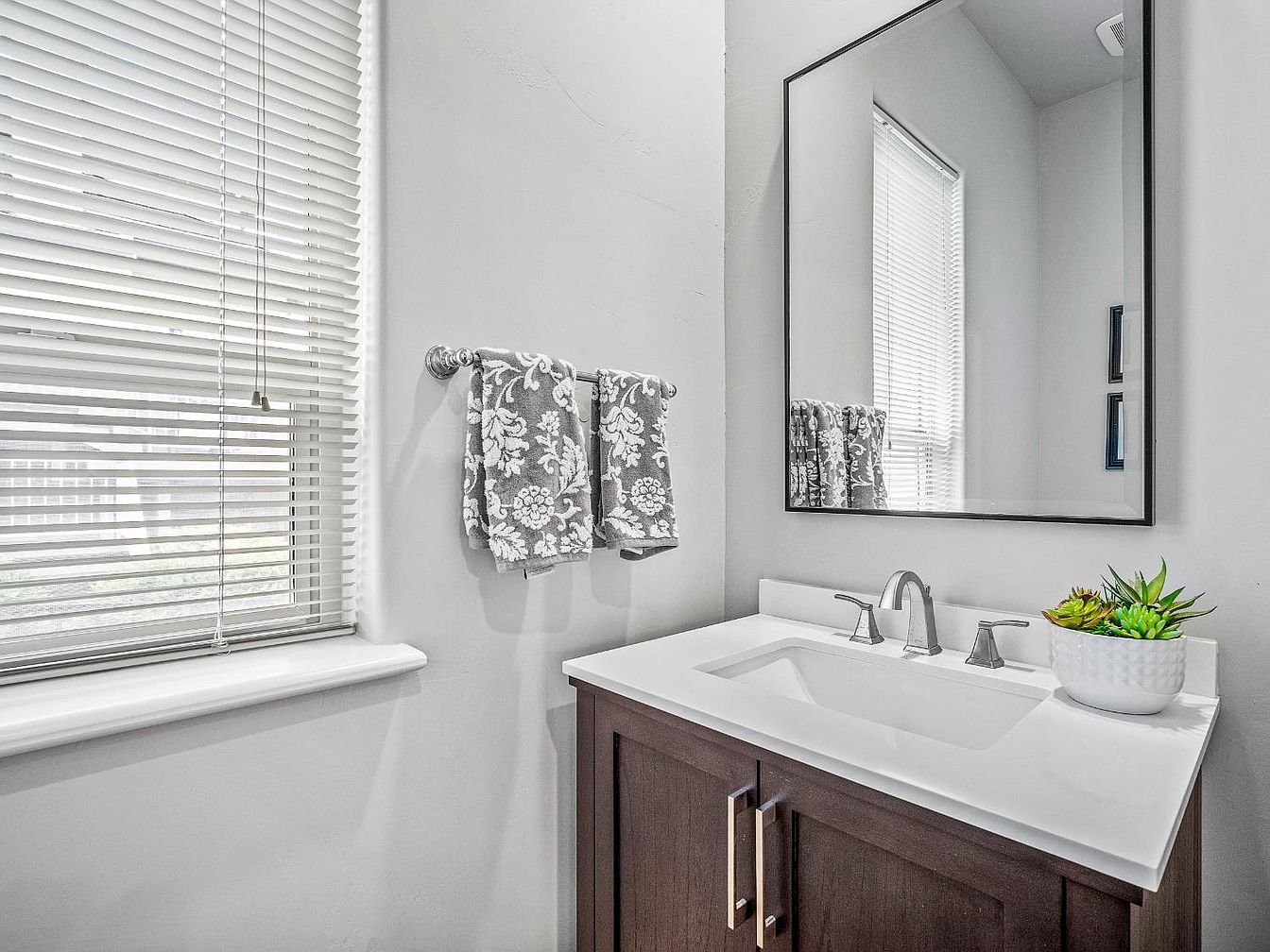 This bathroom corner highlights a sleek, modern vanity setup with a dark wood cabinet base topped with a smooth white countertop. The integrated rectangular sink and contemporary chrome faucet fixtures add a polished touch. A large, clean-lined mirror with a slim black frame extends above the sink, reflecting natural light entering from a nearby window covered with white horizontal blinds. The walls are painted a soft light gray, complementing the neutral palette. Two patterned gray and white hand towels hang neatly on a chrome bar beside the window, while a small white pot with vibrant green succulents adds a fresh, natural accent to the minimalist design.