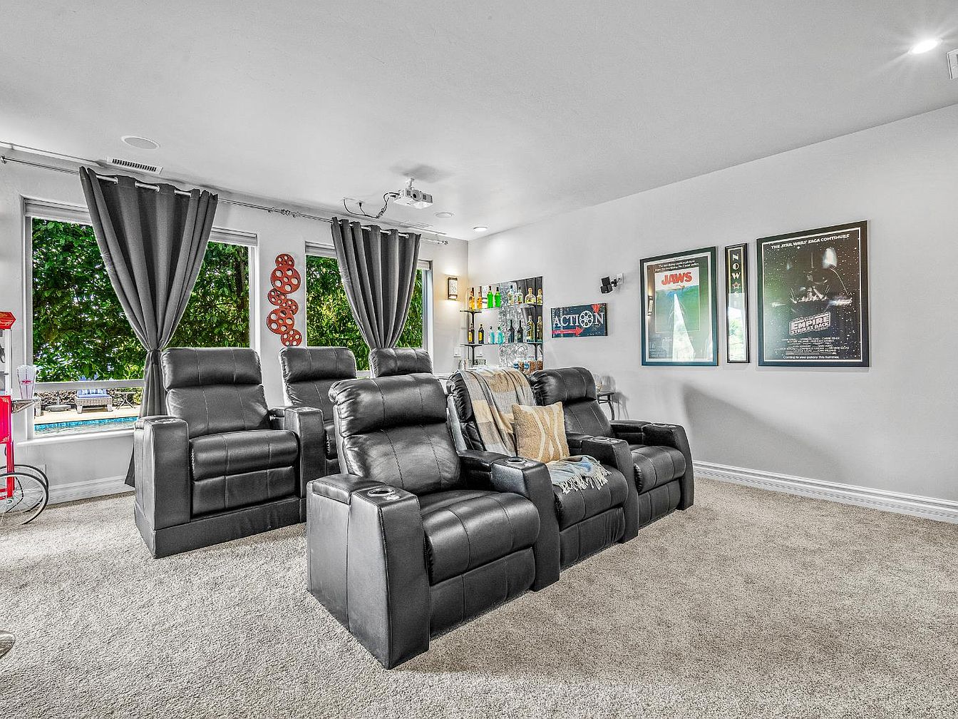 This home theater features two rows of black leather recliners arranged for optimal viewing comfort. The front row has three plush seats, complemented by three more positioned on a raised platform behind, ensuring excellent sightlines. Large windows with dark gray curtains frame the left side wall, allowing natural light when desired but also easy darkening for movie time. A subtle gray carpet covers the floor, enhancing the cozy ambiance. On the right wall, framed classic movie posters add character, while a small bar with shelves stocked with colorful bottles and glassware provides a convenient entertaining space.