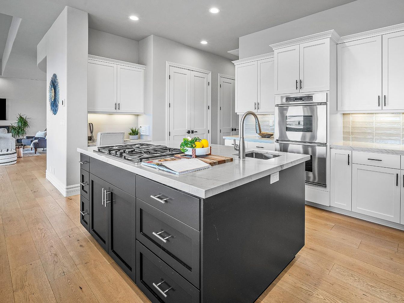 This kitchen boasts a contemporary design with a striking two-tone color scheme. The centerpiece is a spacious island with deep charcoal cabinetry topped by a pristine white marble countertop, featuring an integrated gas cooktop and a sleek stainless steel sink with a high-arc faucet. Surrounding the island are crisp white upper and lower cabinets, complemented by understated black hardware. A double wall oven in stainless steel blends seamlessly into the cabinetry, while under-cabinet lighting softly illuminates glossy subway tile backsplash. Warm, natural wood flooring runs throughout, lending a welcoming contrast to the room’s cool, clean palette.