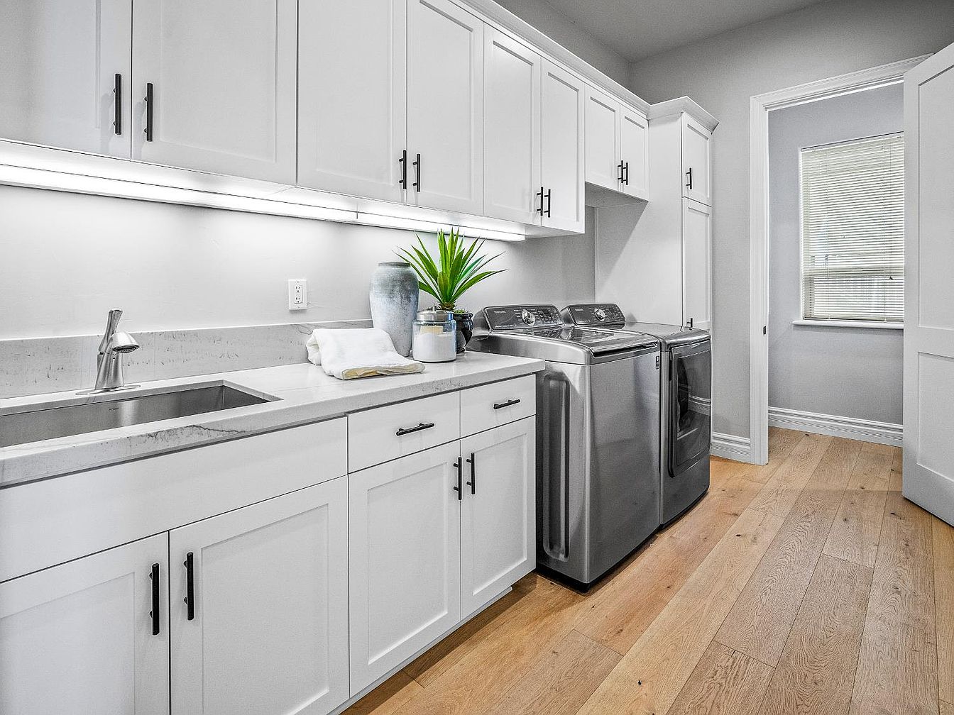 This laundry room combines functionality with fresh, modern aesthetics. It features a long white countertop with a subtle marble pattern that houses a sleek stainless steel sink and faucet on the left. Above and below the counter, pristine white shaker-style cabinets with black hardware provide ample storage. The under-cabinet lighting brightens the workspace, emphasizing cleanliness and efficiency. Two stainless steel front-load washer and dryer units are neatly positioned side by side, matching the room’s contemporary feel. Light wooden flooring adds warmth and contrasts the otherwise cool-toned palette, while a nearby window brings in natural light, enhancing the airy ambiance.