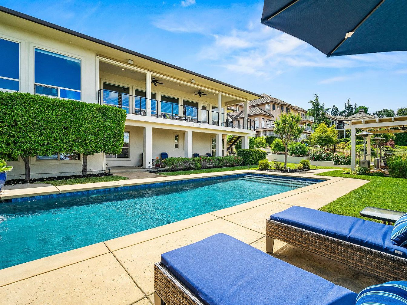 This serene backyard features a rectangular swimming pool set in a smooth concrete deck, surrounded by manicured green lawn and trimmed hedges. Adjacent to the pool, there are comfortable wicker chaise lounges topped with deep blue cushions and matching pillows, inviting relaxation. Overhead, a large blue patio umbrella provides shade, complementing the cushion tones. The two-story home’s exterior is light beige, with large windows and a covered balcony on the upper level outfitted with ceiling fans and glass railings, offering a scenic view of the landscaped garden and neighboring homes. The space combines comfort and style in an inviting outdoor retreat.