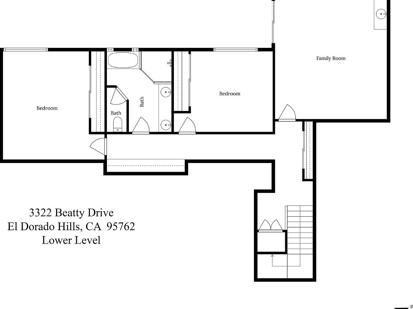 This lower level layout highlights a well-organized space designed for privacy and family use. Two bedrooms flank a shared bathroom with dual sinks, a shower, and a separate toilet area. The family room occupies a spacious area adjacent to one bedroom, likely serving as a cozy retreat or entertainment zone. The staircase access at the bottom right corner connects the lower level to the upper floors. The floor plan is practical and functional, emphasizing straightforward circulation and intimate spaces, perfect for a growing family or guests. The overall design maximizes both comfort and utility.