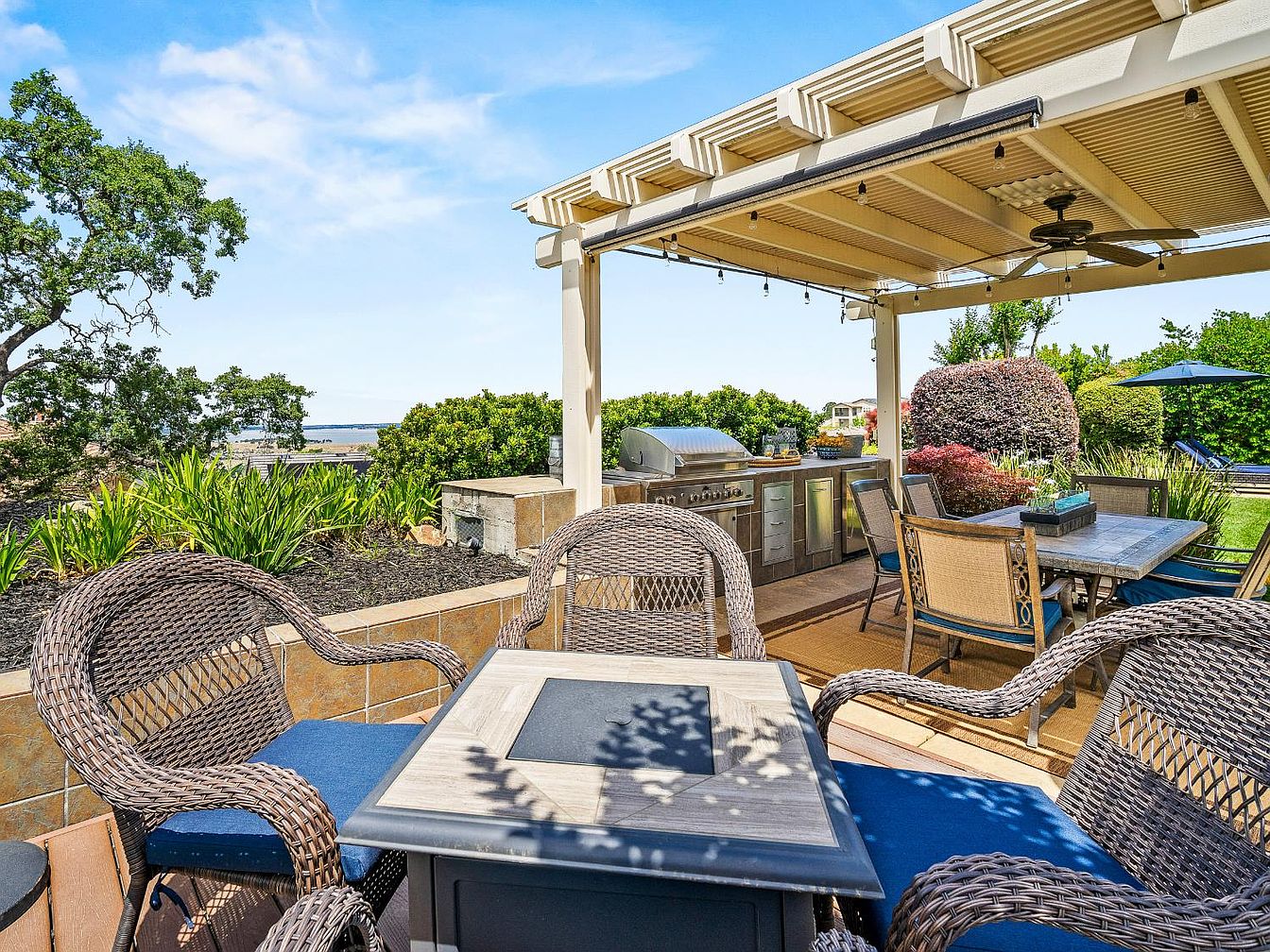This spacious outdoor patio area offers a harmonious blend of casual dining and cooking amenities under a sturdy pergola with string lights and a ceiling fan for comfort. The seating features woven wicker chairs with deep blue cushions, arranged around dining tables with tiled tops for easy maintenance and style. A built-in stainless steel grill and storage cabinets enhance the outdoor kitchen setup, making it ideal for entertaining. The landscaping includes lush greenery and shaped bushes that frame the space, complemented by clear blue skies and distant views, creating a welcoming and serene environment.