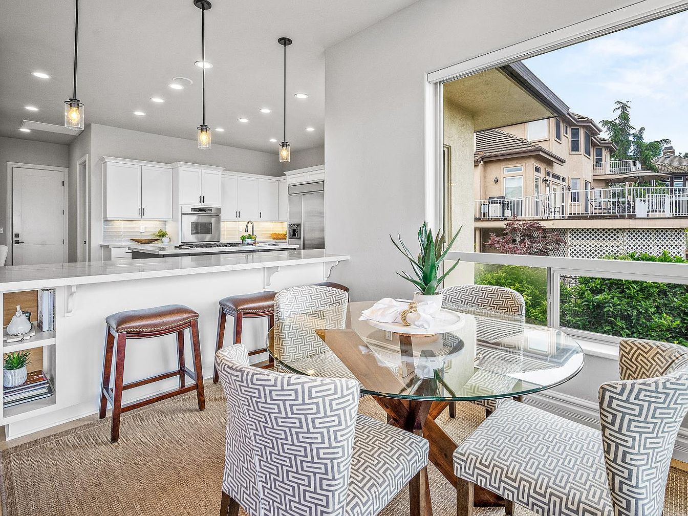 This cozy breakfast nook features a round glass-top table set upon a natural woven rug, surrounded by four upholstered chairs in a modern geometric pattern of gray and white. Adjacent to the nook, a white kitchen island extends with a smooth marble countertop and doubles as a breakfast bar with dark wood stools punctuated by nailhead trim. The kitchen cabinetry is clean and bright white, with stainless steel appliances built in, enhancing the sleek and modern feel. Black pendant lights with exposed bulbs hang in a row, adding a touch of warmth and industrial charm. Large windows flood the space with natural light and provide views of neighboring homes and greenery, creating an inviting atmosphere perfect for casual meals and gatherings.