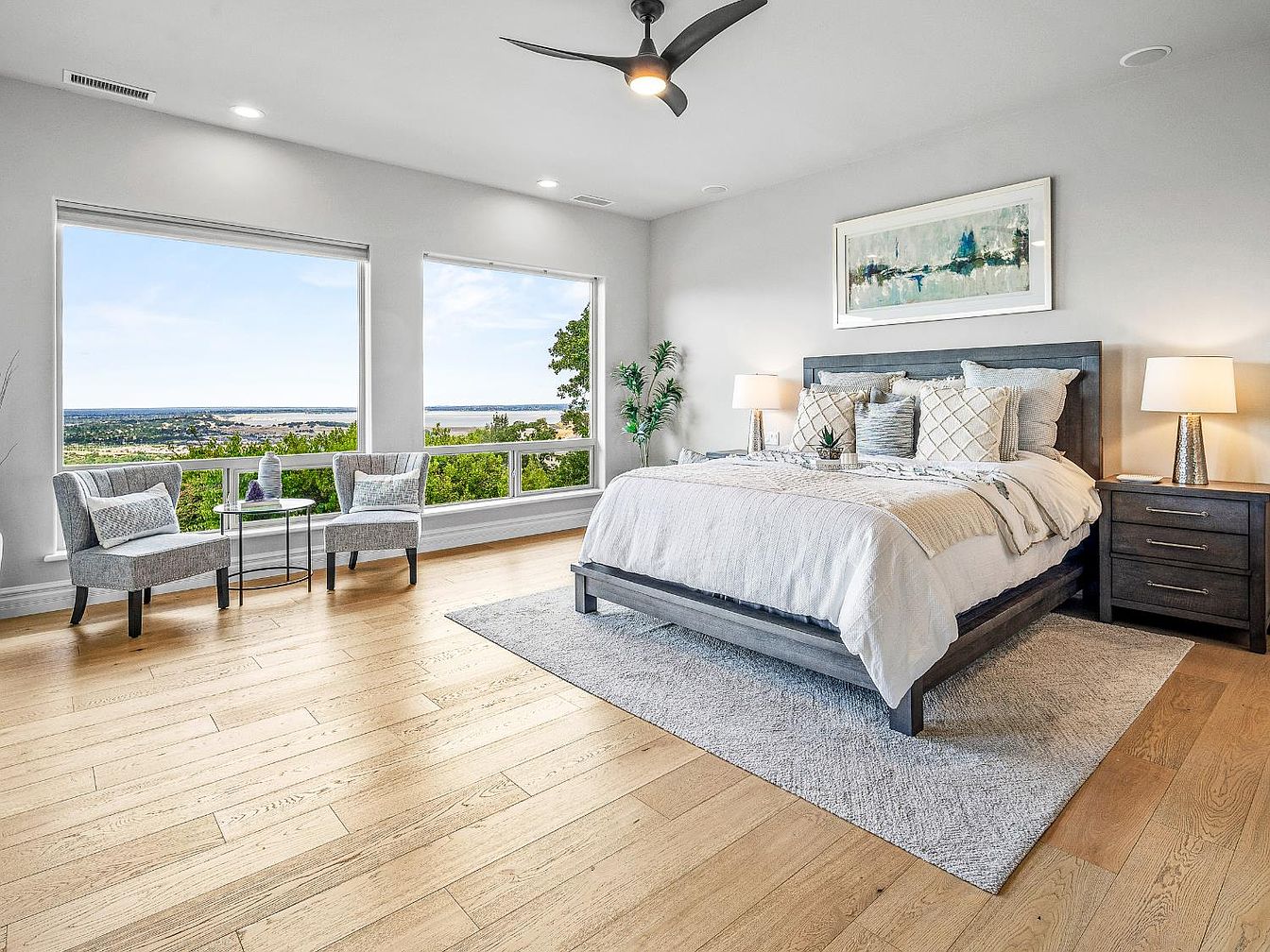 This spacious master bedroom features large floor-to-ceiling windows that showcase an expansive scenic view of greenery and distant water, inviting natural light to flood the space. The room’s neutral palette blends soft grays, whites, and natural wood flooring, creating a calm, airy ambiance. Against one wall, a modern dark wood bed is layered with textured white and gray bedding and pillows, flanked by matching nightstands topped with elegant lamps. Two gray accent chairs with patterned cushions frame a small round glass table by the windows, offering a cozy sitting area to enjoy the view. A simple blue and green abstract painting adds a touch of color above the bed, complementing the serene aesthetic.