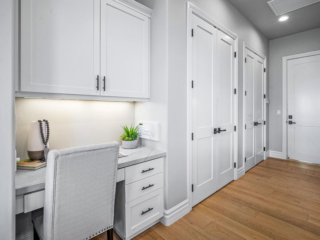This compact nook is cleverly incorporated into the home’s entryway or hallway, featuring a built-in desk with a sleek white countertop and matching cabinetry. The cabinetry above and drawers below provide ample storage, maintaining a clutter-free workspace. A soft, gray upholstered chair with nailhead trim adds comfort and subtle elegance. The walls are painted in cool gray tones, complementing the white woodwork and enhancing the bright, modern feel. Warm wood flooring balances the cool color palette, creating a welcoming transition space. Under-cabinet lighting illuminates the desk area perfectly, highlighting both function and style.