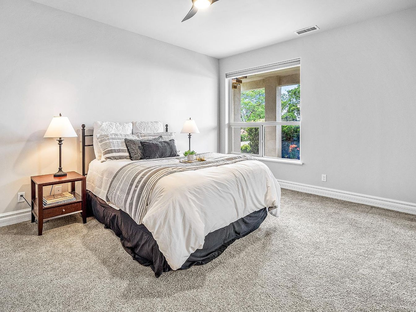 This master bedroom features a tranquil and airy layout designed for comfort. A queen-sized bed is dressed in neutral tones, combining whites, grays, and soft patterns, with a mix of pillows adding texture. Two matching bedside tables flank the bed, each topped with classic table lamps that provide warm, ambient lighting. The walls are painted white, enhancing natural light streaming through a large window that offers garden views. Plush carpet flooring adds coziness underfoot, and simple white trim along the baseboards accents the room’s clean, understated elegance. The overall aesthetic is calm, inviting, and uncluttered.