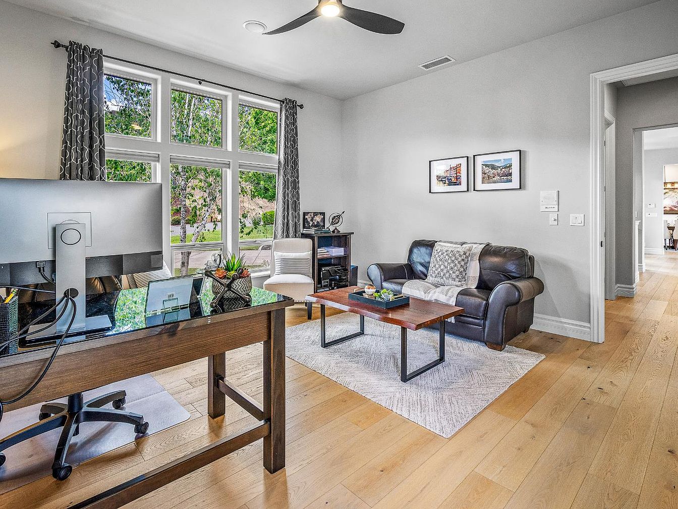 This inviting home office corner combines work and relaxation seamlessly. A large wooden desk with a glossy black top holds a modern computer setup, paired with a comfortable office chair. Adjacent is a cozy seating area featuring a dark leather loveseat adorned with a textured throw, complemented by a light upholstered chair. The natural light floods through expansive windows with simple gray patterned curtains, highlighting the light wood flooring that runs throughout. Neutral tones dominate the palette, accented by tasteful artwork and subtle greenery, creating a calm, functional, and stylish workspace.