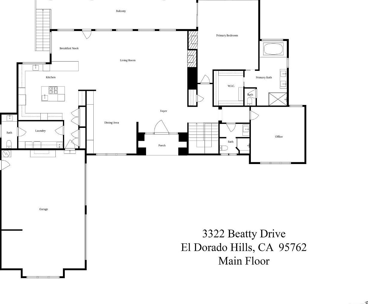 This floor plan outlines a spacious and functional main level, ideal for comfortable living and entertaining. The open-concept kitchen features a central island and flows seamlessly into the breakfast nook and the expansive living room, which opens up to a generous balcony. Adjacent to the living area is a distinct dining space positioned near the foyer and porch entrance. The primary bedroom suite includes a walk-in closet and a large bath with separate tub and shower. Additional rooms include an office, multiple bathrooms, a laundry room near the garage, and a clear circulation path linking all spaces efficiently.