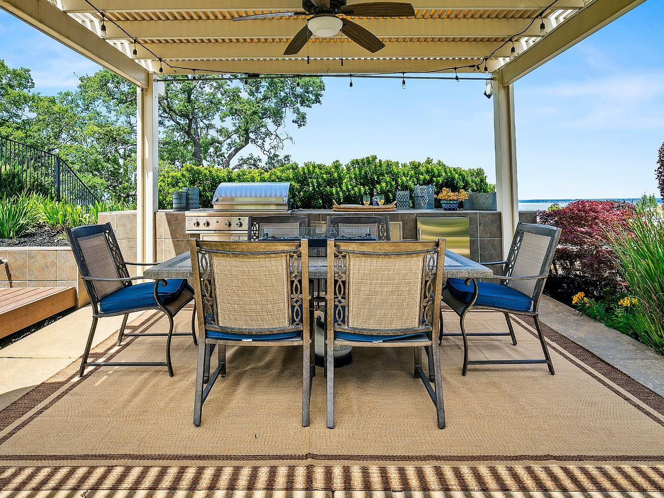 This outdoor dining space blends comfortable seating with practical amenities, inviting gatherings under a pergola-style roof equipped with a ceiling fan and string lights for ambiance. A rectangular table is surrounded by six metal-framed chairs featuring neutral woven backs and deep blue seat cushions, positioned atop a textured beige rug with a geometric border pattern. Beyond the seating, a built-in stainless steel grill and countertop provide a functional grilling station, complemented by greenery and decorative planters that frame the area. The open layout overlooks lush landscaping and distant scenic views, creating a serene and stylish al fresco experience.