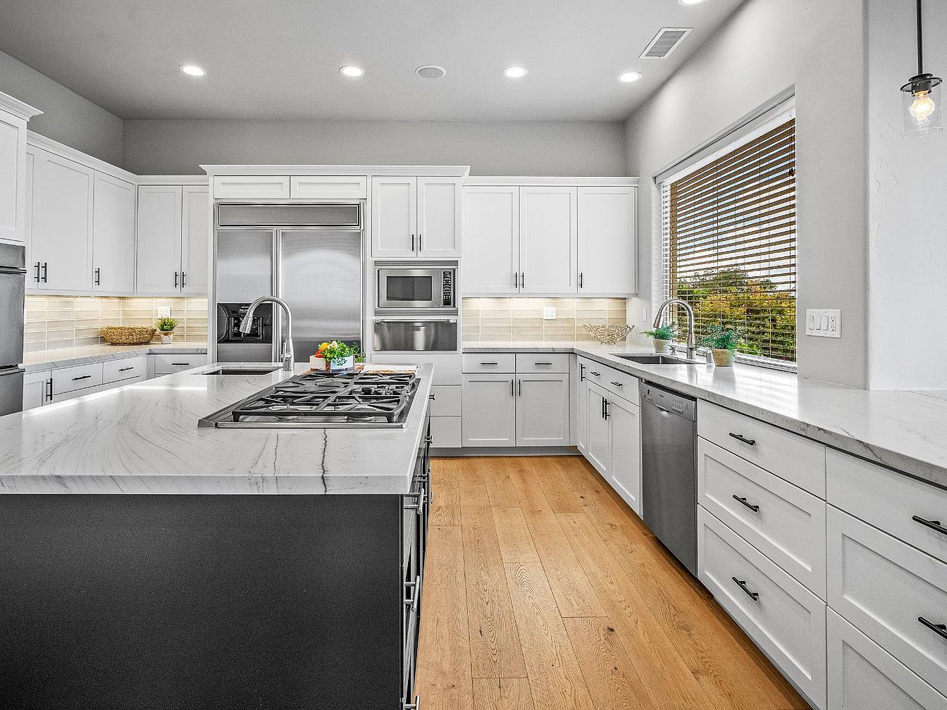 This kitchen features a spacious and open U-shaped layout with an oversized central island that hosts a built-in gas cooktop and sink. The cabinetry is elegant with white shaker-style doors, complemented by sleek black hardware, offering ample storage. Countertops and island surfaces are covered in polished white marble with subtle grey veining, enhancing the clean, contemporary aesthetic. Soft under-cabinet lighting highlights a neutral-toned backsplash, creating warmth against the light grey walls. Stainless steel appliances, including a large refrigerator, microwave, and dishwasher, add a modern touch. Light hardwood flooring brings natural texture, while a large window with wooden blinds invites abundant daylight.