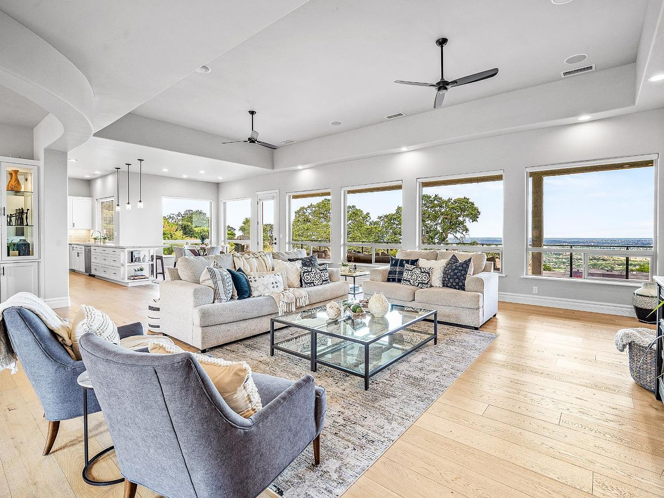 This expansive living room features a bright and open layout with large windows offering panoramic views of the surrounding landscape. The space is anchored by two beige sofas adorned with an array of textured, neutral-toned and navy blue throw pillows, complemented by two comfortable gray armchairs with accent pillows. A low, square glass coffee table sits atop a subtly patterned area rug with earthy tones that harmonize with the light wide-plank hardwood flooring. The white walls and ceiling create a fresh, airy atmosphere, enhanced by recessed lighting and two ceiling fans. The adjoining kitchen is visible, maintaining cohesive modern aesthetics with pendant lighting and white cabinetry.