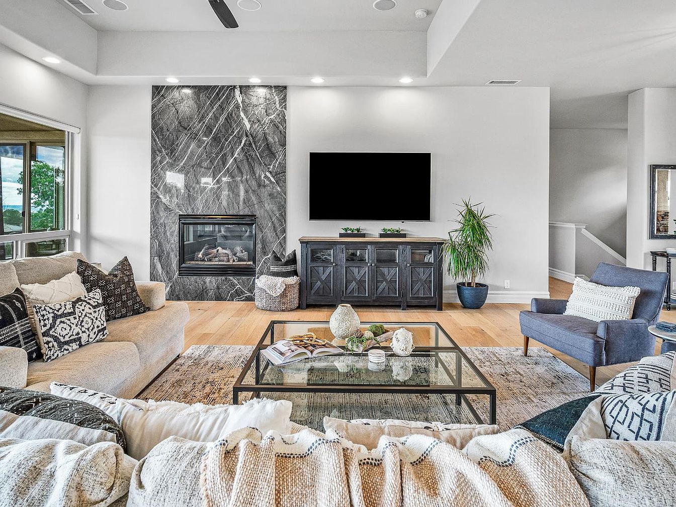 This living room blends modern comfort with natural textures. A sleek black marble fireplace serves as a focal point, flanked by a mounted flat-screen TV above a dark wooden console with glass-paneled doors. Light wood flooring extends throughout, contrasting subtly with neutral-toned furniture. Plush beige and gray sofas, accented with a variety of patterned throw pillows, offer inviting seating around a minimalist glass coffee table that holds decorative ceramics and greenery. A blue upholstered armchair adds color depth, while a large window allows natural light to enhance the room’s airy, stylish ambiance. Recessed lighting and a ceiling fan complete the serene environment.