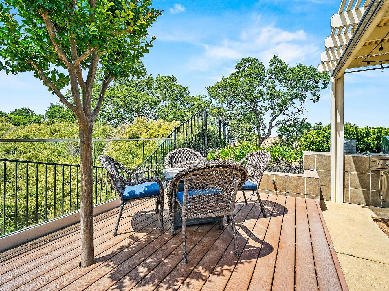 This inviting outdoor deck features warm-toned wooden flooring that complements the natural greenery surrounding the space. A square glass-top dining table is paired with four woven rattan chairs, each fitted with deep blue cushions which add a splash of color to the neutral wood and earth tones. The seating area sits adjacent to a built-in outdoor kitchen with tiled facing, stainless steel grill, and a countertop under a cream pergola, ideal for outdoor entertaining. The railing is black metal with a minimalist design, providing safety without obstructing the expansive views of the vibrant tree canopy and clear sky beyond.