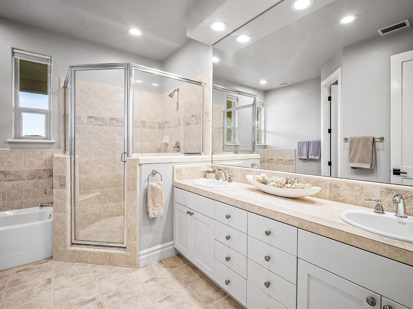 This spacious master bathroom features a neutral color palette dominated by soft beige and light gray tones. The large vanity has a long countertop with two sinks, white cabinetry, and classic chrome fixtures, combining functionality with subtle elegance. A large mirror extends the entire length above the vanity, enhancing the sense of space and light. The tiled shower with a clear glass door has a built-in bench and is adjacent to a white bathtub, both surrounded by coordinating tiles with a decorative horizontal band. Recessed lighting provides ample illumination, while neatly hung towels add a touch of warmth and softness to the clean, modern design.