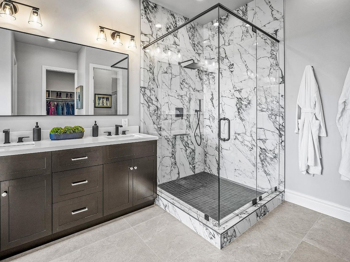A sleek and modern bathroom features a dual-sink vanity with a dark wood finish and minimalist silver hardware. Above it spans a large, frameless mirror reflecting light and the adjacent closet space. The shower enclosure highlights a striking contrast with white marble walls veined in gray, surrounded by glass panels with black metal accents, creating an upscale look. The shower floor is tiled in small dark gray squares, incorporating a built-in marble seat. Neutral, light beige floor tiles extend across the room, while two white robe hooks on the adjacent wall add comfort and convenience.