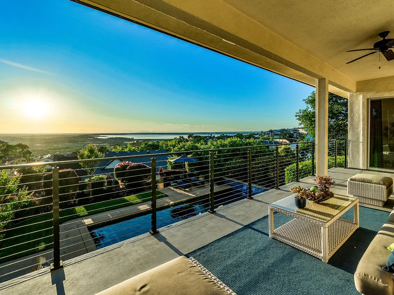 This expansive outdoor balcony offers a serene seating area with a comfortable cushioned sofa and a woven coffee table atop a muted blue rug, blending modern textures with natural surroundings. The railing features sleek horizontal metal cables, providing unobstructed panoramic views of lush greenery, rooftops, and a distant body of water under a bright, clear sky at sunset. The ceiling fan and clean architectural lines enhance comfort and style, making it a perfect spot for relaxation or entertaining while enjoying the stunning vistas and warm ambiance of the setting sun.