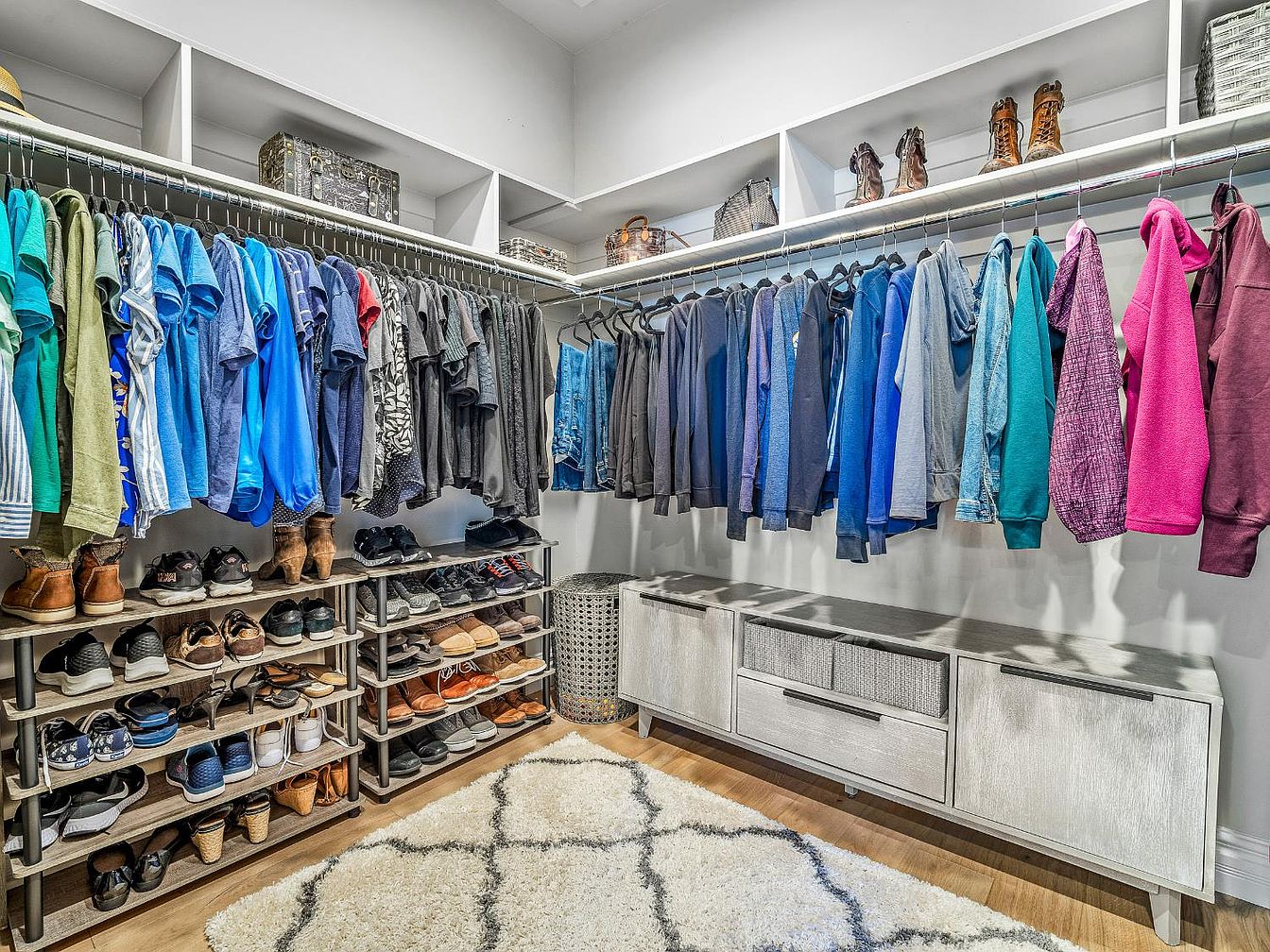 This spacious walk-in closet features a practical and organized layout with clothing rods lining two walls, offering ample hanging space for shirts, hoodies, and jackets arranged by color. Below one rod, open shelving provides storage for a wide collection of shoes, while a long, modern, light wood cabinet offers additional concealed storage with woven drawer fronts. The walls and ceiling are painted a clean, soft gray, complementing the muted wood flooring and adding a calming vibe. A plush, neutral-toned rug with a subtle geometric pattern warms the floor, enhancing the cozy yet minimalist aesthetics. The upper shelves display travel bags and baskets, adding functional charm to this well-thought-out dressing area.