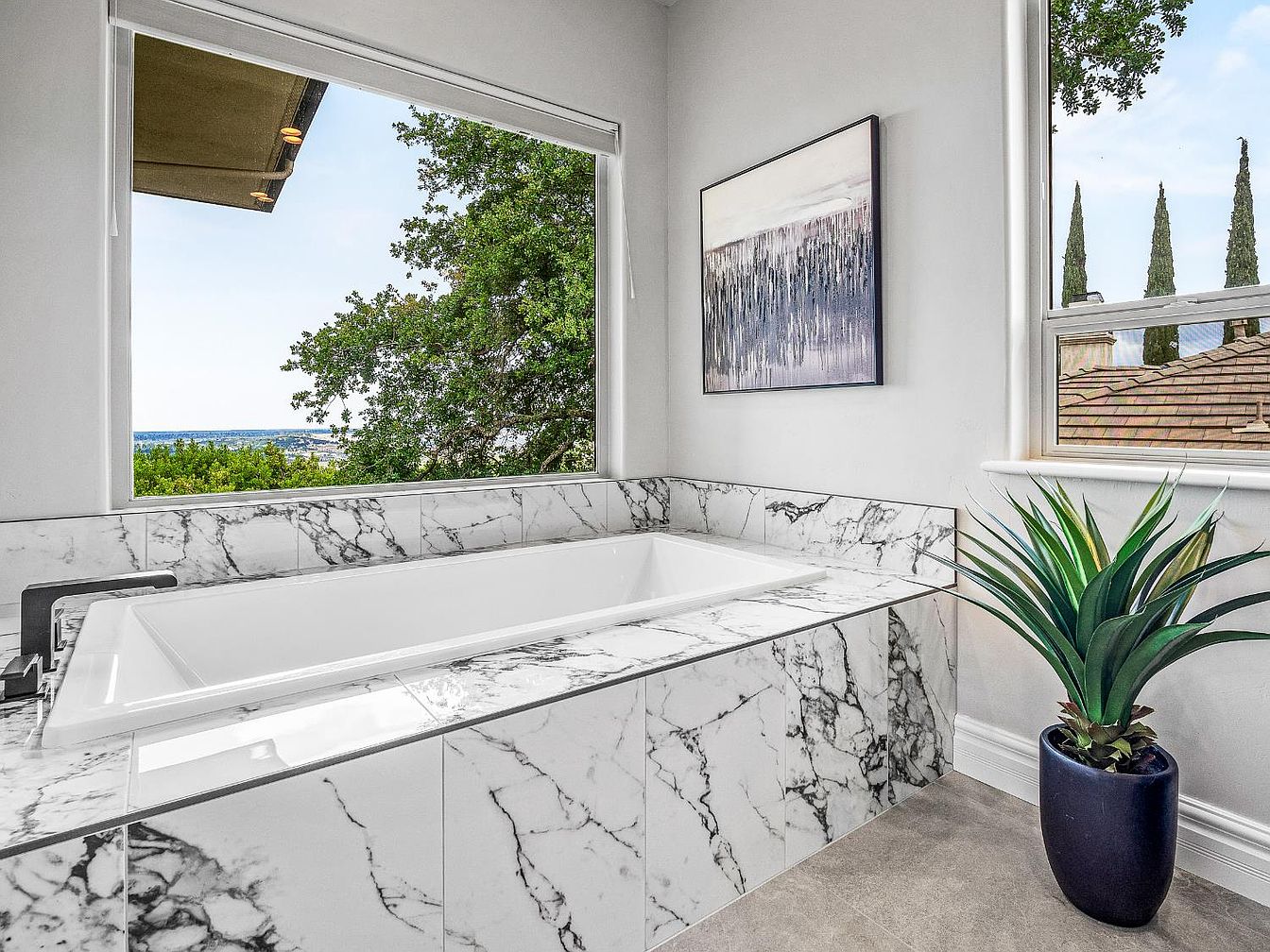 This serene bathroom corner features a sleek bathtub encased in polished white marble with dramatic gray veining, creating a luxurious spa-like feel. Large windows on two sides flood the space with natural light and offer tranquil views of lush greenery and distant rooftops. The walls are painted a crisp, clean white, complementing the marble’s elegance. A contemporary abstract painting in muted tones adds subtle artistic interest above the tub. A tall green potted plant in a dark blue pot on the floor introduces a refreshing touch of nature and balances the minimalist, modern aesthetic.