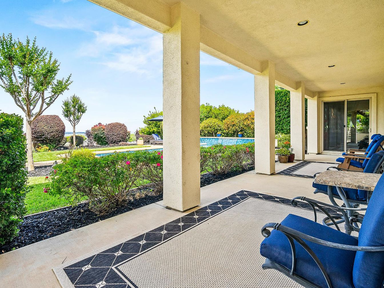 This covered patio features a spacious seating area with multiple blue-cushioned armchairs framing a small, mosaic-topped side table, inviting relaxation outdoors. The ceiling has recessed lighting for evening ambiance. The floor is accented with an area rug that exhibits a woven beige center bordered by a black and white patterned frame, complementing the neutral beige stucco columns and ceiling. Beyond the patio is a lush garden with trimmed bushes and flowering plants, adding vibrant greenery. The view extends to a glistening pool and manicured lawn, creating a tranquil, elegant outdoor living space ideal for unwinding or socializing.