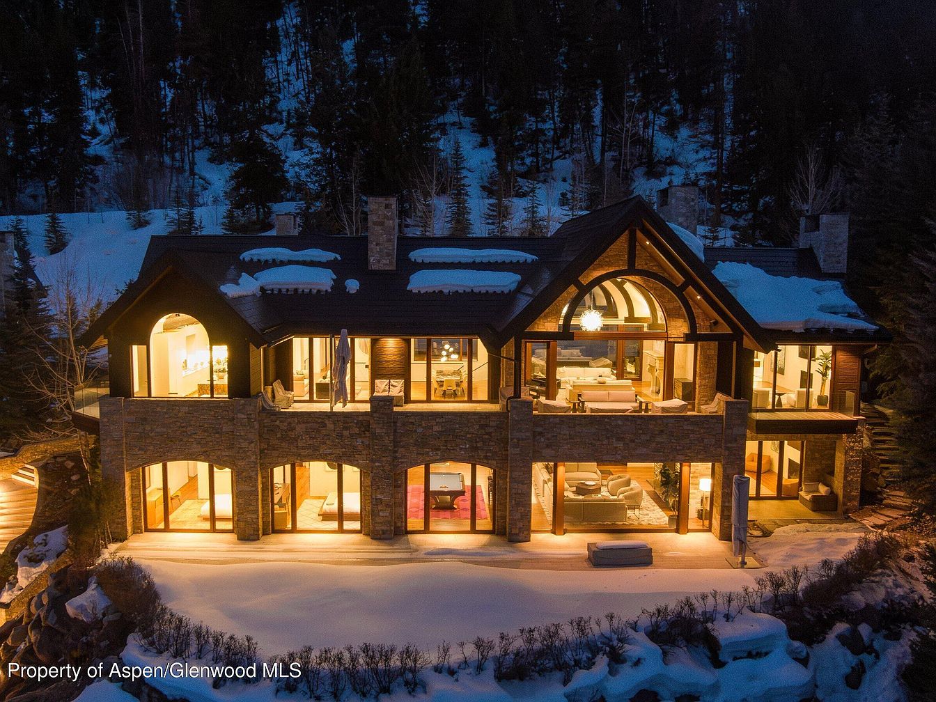 This stunning two-story mountain home is beautifully illuminated against a snowy forest backdrop, showcasing warm, inviting interior lighting through expansive floor-to-ceiling windows. The exterior features a combination of stone and wood finishes, highlighting rustic yet refined architectural elements. The roof is partially blanketed in snow, complementing the natural surroundings. Large arched windows and multiple outdoor seating areas on both levels create a seamless connection between indoor and outdoor spaces. The warm yellow glow speaks to a cozy, elegant ambiance, perfect for winter retreats amid serene, wooded scenery.