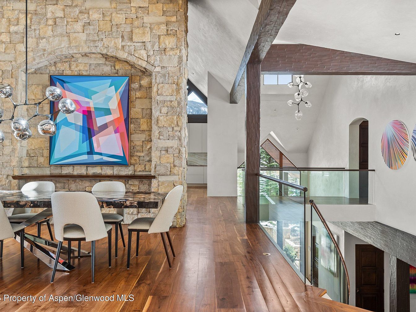 This dining space features a rich, warm wood floor that extends into the adjacent hallway. The dining table has a dark, textured surface paired with modern, upholstered chairs in a neutral light gray, complementing the stone accent wall behind it. The stone wall adds rustic character and serves as a backdrop for vibrant geometric artwork in blues, pinks, and oranges. A contemporary chrome chandelier with reflective globes hangs over the table, enhancing the modern aesthetic. The hallway showcases a striking blend of white plaster walls, dark wood beams, and glass railings, leading to a stairway and upper-level views. Circular colorful wall art adds a playful touch to the otherwise serene, architectural space.