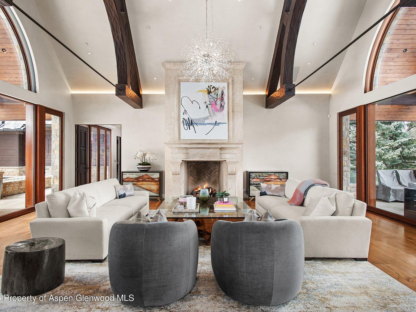 This expansive living room combines rustic and modern elegance with its vaulted ceiling featuring exposed, dark wooden beams contrasted against crisp, white walls. Floor-to-ceiling arched windows framed in warm wood flood the space with natural light and offer scenic outdoor views. The symmetrical seating arrangement includes two plush cream sofas and two rounded charcoal gray chairs centered around a glass coffee table atop a subtly patterned area rug. A majestic stone fireplace anchors the room, topped with contemporary abstract art, while a dazzling, starburst chandelier adds a touch of glamour and draws the eye upward, emphasizing the room’s height and airy ambiance.