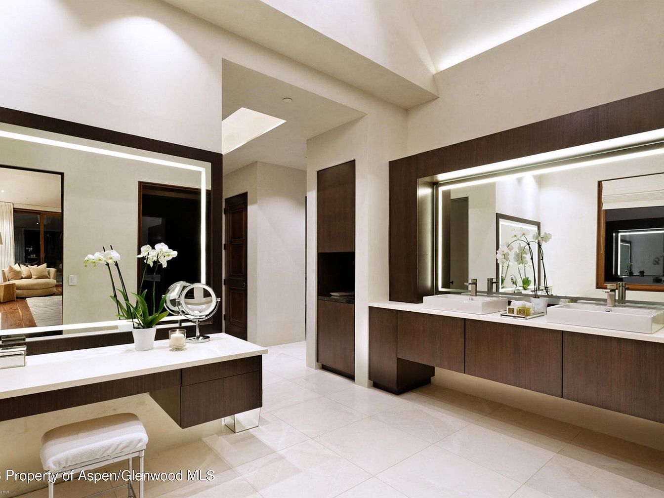This spacious bathroom section features a modern, floating vanity unit in rich dark wood with sleek, handle-less cabinetry. Two rectangular vessel sinks sit atop a clean white countertop, reflecting the minimalist elegance of the area. A large backlit mirror spans the length of the vanity, providing ample lighting and visual depth. The complementary makeup station on the left is integrated seamlessly, with a cushioned stool and a smaller mirror, creating a functional and stylish dressing area. Light cream-colored floor tiles and walls enhance brightness, while subtle architectural details like the ceiling recess add sophistication and openness to the space.