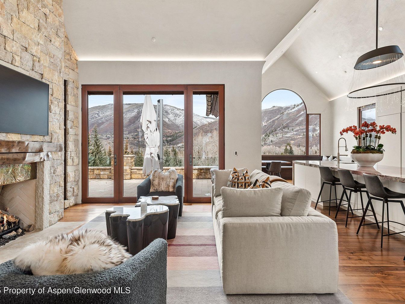 This open-concept living room blends seamlessly into the adjacent kitchen, defined by clean lines and natural warmth. A large stone fireplace anchors one side, with a rustic wooden mantle and a modern flat-screen TV above. Plush, neutral-toned sofas and accent chairs, adorned with fur throws and geometric pillows, provide cozy seating. Floor-to-ceiling sliding glass doors framed in deep wood invite abundant natural light and reveal stunning mountain views. The kitchen island, with a marble countertop and black barstools, balances elegance and functionality. Vaulted ceilings with cove lighting and arched windows enhance the airy, inviting atmosphere.