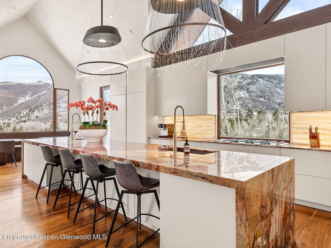 This kitchen features a spacious island with a polished marble countertop that extends to form a waterfall edge, creating a luxurious focal point. The island is paired with sleek, black bar stools that offer comfortable seating. Matte white cabinetry lines the walls, providing ample storage and a clean, minimalistic look. Large windows frame picturesque mountain views, flooding the space with natural light. Unique modern pendant lights with delicate, thread-like details hang above the island, enhancing the airy atmosphere. Warm wooden flooring adds an organic touch, balancing the contemporary design with natural elements.