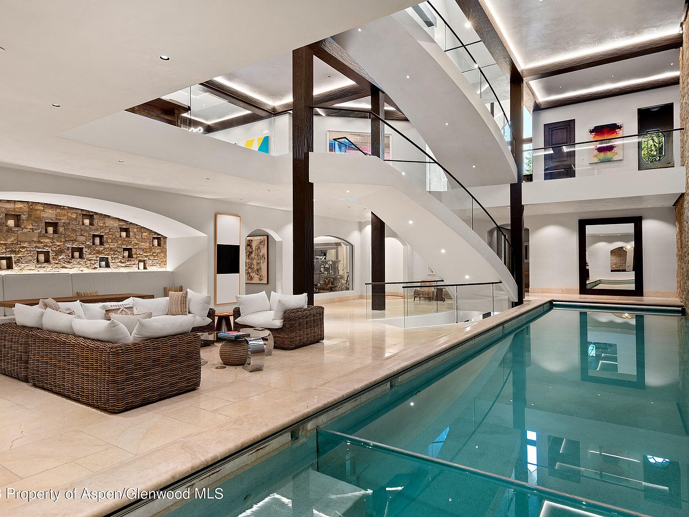 This luxurious indoor pool area features a sleek, curved swimming pool bordered by polished beige stone flooring that extends to a stylish seating nook. The lounge area includes comfortable white cushions on woven rattan sofas, complemented by neutral-toned pillows that invite relaxation. Architectural elegance is highlighted by the grand white staircase with glass and metal railing, leading to an open mezzanine level with modern artwork. Dark wood beams contrast crisply with pristine white walls and ceilings, while recessed lighting and accent stonework add texture and warmth, creating an inviting yet sophisticated atmosphere.