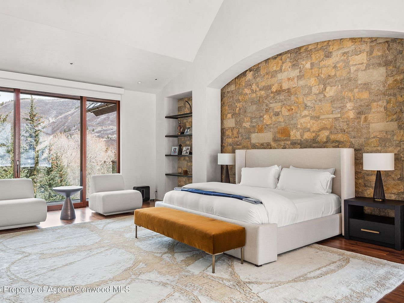 This master bedroom combines rustic charm with modern elegance, highlighted by a captivating stone accent wall behind the plush, upholstered bed in soft beige tones. The vaulted ceiling and white walls brighten the space, enhancing its spaciousness. Adjacent to the bed, sleek black nightstands contrast beautifully with the neutral palette, each topped with chic, contemporary lamps. A mustard-colored velvet bench anchors the room, adding a warm pop of color. Floor-to-ceiling windows framed in rich wood invite stunning mountain views and abundant natural light. Minimalist shelving in a recessed nook displays artful decor, balancing texture and simplicity throughout.