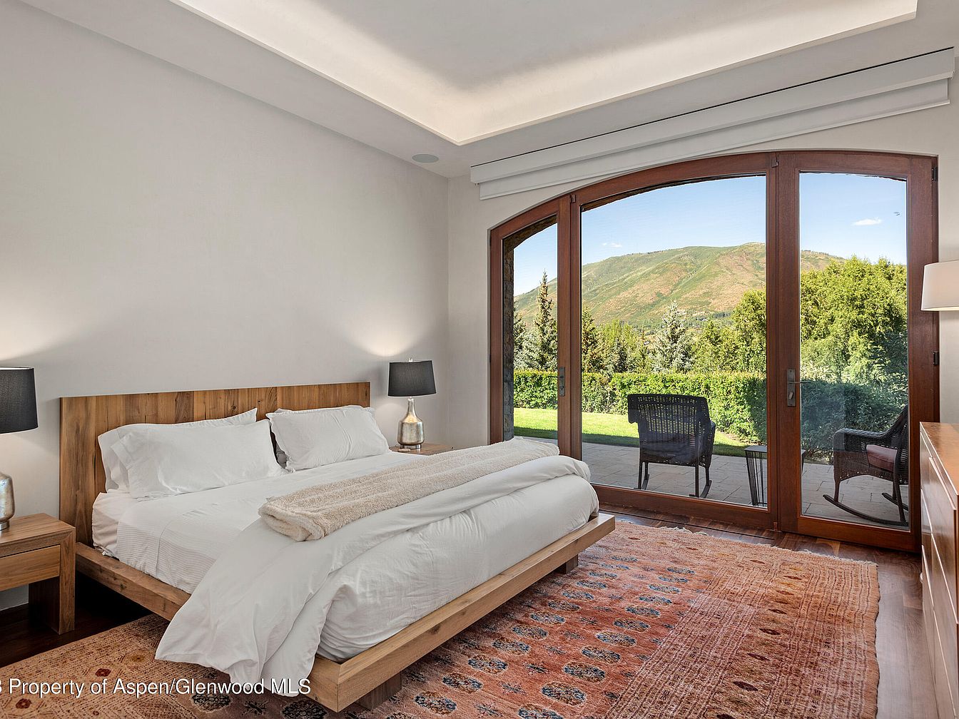 This serene bedroom features a minimalist design with clean lines and natural wood elements. The centerpiece is a low-profile wooden bed frame complemented by crisp white bedding, creating a fresh and inviting atmosphere. Two matching wooden nightstands flank the bed, each topped with a sleek modern lamp sporting black shades that add a touch of contrast. A large, warm-toned area rug with intricate patterns anchors the space. The room’s standout architectural element is the expansive arched glass door framed in rich wood, leading out to a patio with views of lush greenery and rolling hills, blending indoor comfort with nature’s tranquility.