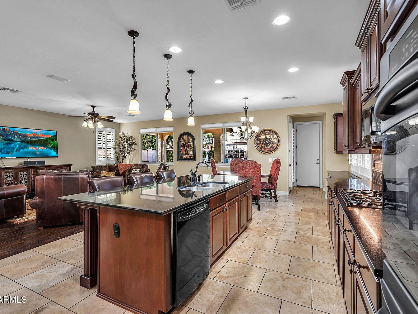 This open-concept space combines a kitchen, dining area, and living room with a warm, inviting atmosphere. The kitchen features rich, dark wood cabinetry paired with sleek black countertops and matching appliances, including a dishwasher and built-in oven. A large island with a double sink offers ample workspace and seating, illuminated by three elegant pendant lights with twisted metal detailing. Adjacent to the kitchen, a dining nook displays upholstered chairs in a red patterned fabric beneath a classic chandelier. The living room area includes leather furniture, a ceiling fan with light fixtures, and a large flat-screen TV mounted above a decorative wooden console. Neutral tile flooring extends throughout, complementing the beige wall color and creating cohesion between the spaces. Large windows bring natural light and views of the outside, enhancing the open, airy feel.