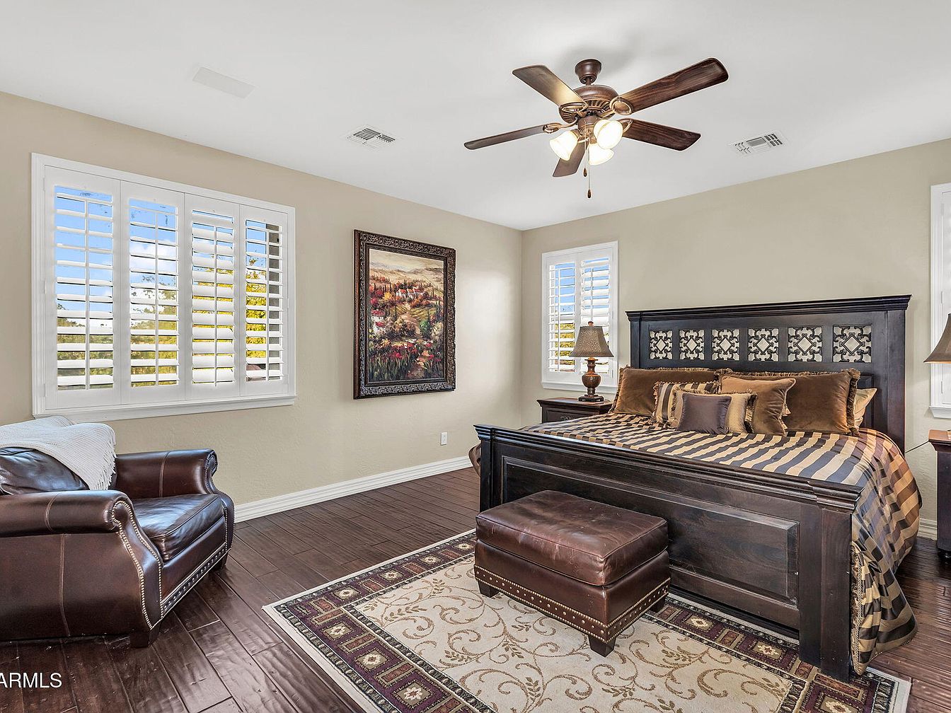 This master bedroom offers a warm and inviting atmosphere with a neutral beige wall palette that complements the rich dark wood furniture. The bed, with an intricately carved headboard, is adorned with striped bedding and multiple plush pillows in earthy tones. Flanking the bed are matching nightstands topped with classic lamps, providing symmetry and cozy lighting. A large leather armchair with visible stitch detailing and a matching ottoman add comfort and a touch of luxury. Hardwood floors with a patterned area rug anchor the space. White plantation shutters allow natural light to softly illuminate the room. A large framed painting injects color and character to the otherwise serene setting, while a ceiling fan with wooden blades adds function and rustic charm.