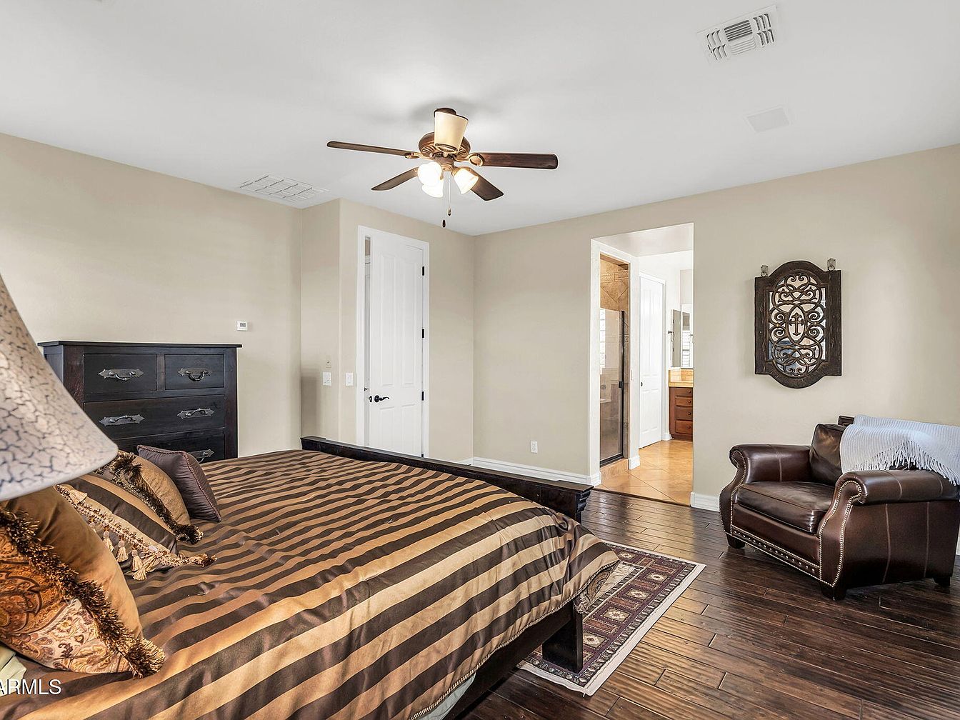 This master bedroom features a warm, inviting color palette centered on beige walls and rich dark wood flooring that adds depth and contrast. The bed, dressed in a luxurious striped brown and tan comforter with matching pillows, anchors the room. A classic dark wood dresser complements the bed’s frame, enhancing the cohesive look. The ceiling fan with wooden blades and glass light fixtures provides functional elegance overhead. To the right, a dark leather armchair with studded trim invites relaxation, while a decorative wall piece adds artistic interest. An open doorway offers a glimpse into the connected bathroom with warm tile flooring, amplifying the room’s sense of space and comfort.