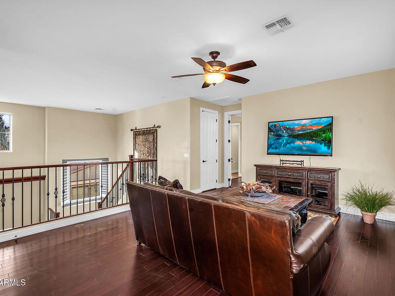 This inviting upstairs loft serves as a cozy lounge area overlooking the staircase with decorative wrought iron railings. Warm beige walls complement the rich, dark hardwood floors, creating a calming, neutral backdrop. A large, dark brown leather sofa anchors the space, oriented toward a rustic wooden TV console that supports a mounted flat screen television. The table in front of the sofa features an intricate tile top, adding texture and interest. A ceiling fan with wooden blades and a soft yellow light fixtures provides comfort and ambient lighting. A potted plant adds a touch of greenery near the corner, while a tapestry hanging on the wall enhances the room’s warm and welcoming ambiance.