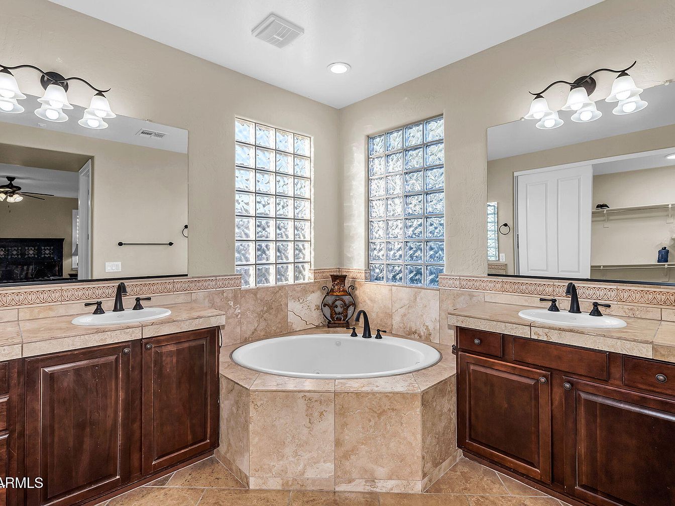A luxurious corner bathtub is framed by elegant beige marble tiling that extends halfway up the walls, seamlessly integrating with the built-in countertop. Flanking the tub are two identical vanities, each equipped with a white sink and rich dark wood cabinetry beneath, providing ample storage. Above each vanity hangs a large mirror framed by classic, ornate light fixtures with frosted glass shades, casting a warm glow. The walls are painted a soft taupe, complementing the natural stone hues. Glass block windows bring in natural light while maintaining privacy, creating a calm, spa-like retreat.