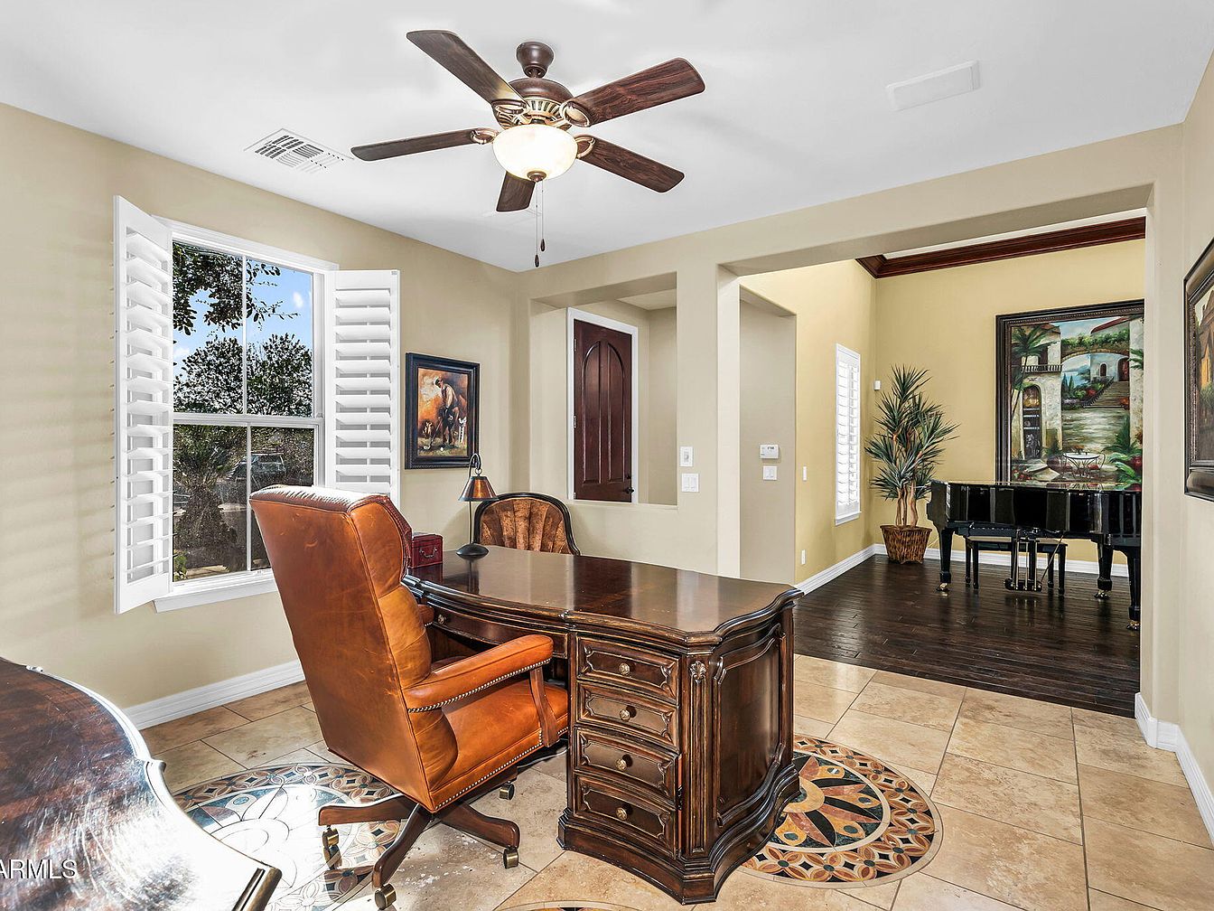 This space combines a sophisticated home office with a cozy adjoining music nook. The office features warm beige walls, complemented by classic dark wood furniture including an ornate desk paired with a cognac leather swivel chair. Large white plantation shutters frame a window allowing natural light to highlight the detailed tile inlay on the floor beneath the desk. A ceiling fan with wood blades adds traditional charm. Adjacent, the music nook is defined by rich dark hardwood flooring, a glossy black grand piano, and a large colorful painting over it. A green potted plant adds a natural accent to the inviting atmosphere.
