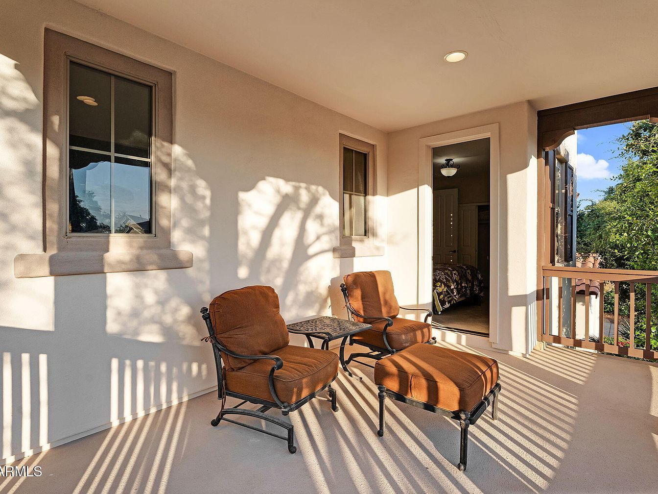 This inviting balcony features a simple yet comfortable arrangement with two cushioned armchairs and a matching ottoman in warm rust tones, paired with a small wrought iron side table. The space is bathed in natural sunlight filtering through wooden railings, casting dynamic shadows on the light, neutral flooring and surrounding cream-colored walls. Two rectangular windows provide architectural interest while framing views and allowing ambient light. An open doorway leads directly into a bedroom, connecting indoor and outdoor living. The overall design balances rustic metal accents with earthy upholstery, creating a tranquil outdoor retreat.