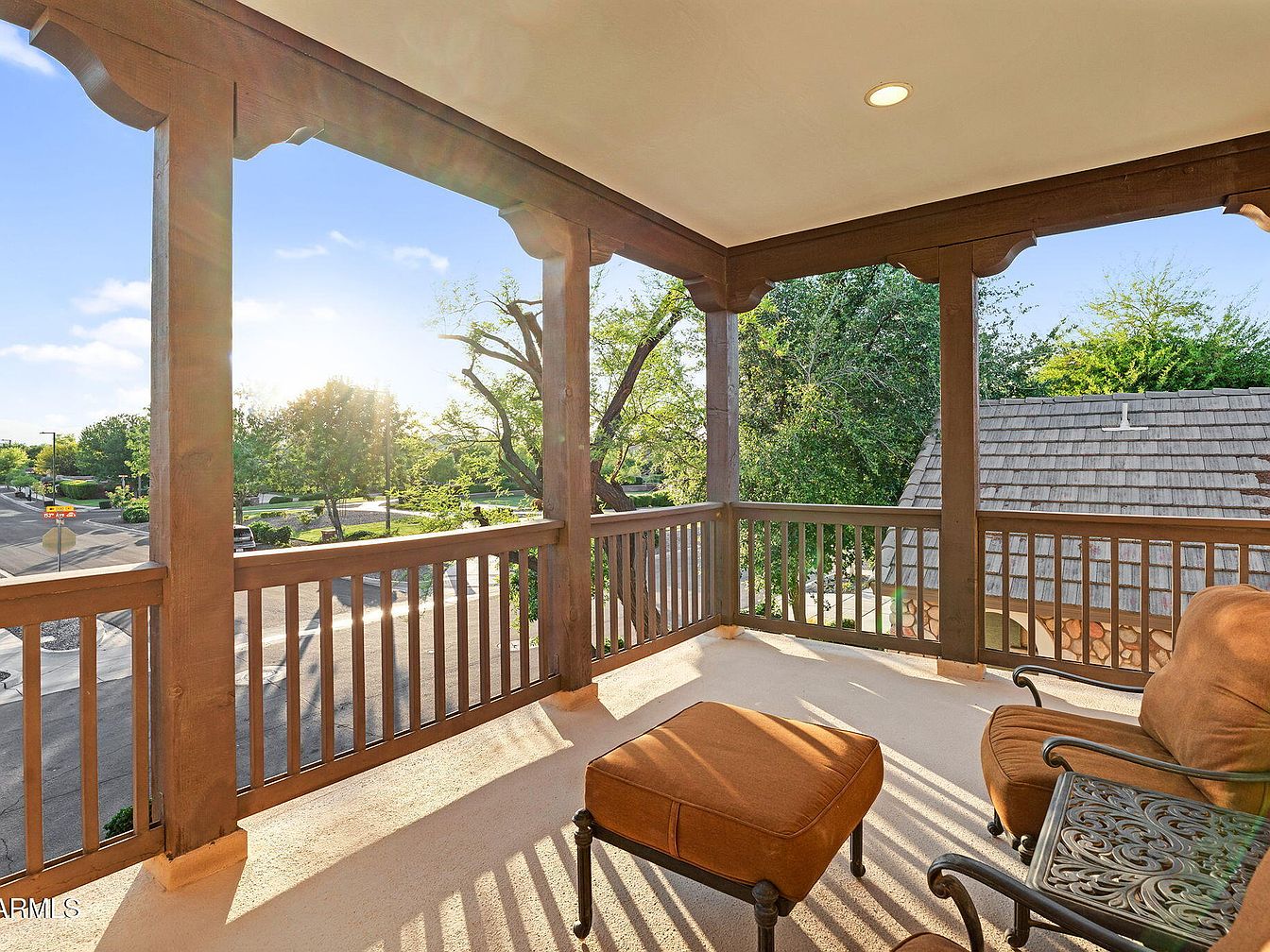 This cozy balcony area offers a tranquil outdoor retreat with a warm, inviting atmosphere. Solid wooden beams and railing frame the space, showcasing a rustic yet refined architectural style. The light cream floor contrasts beautifully with the rich brown wood tones, which match the plush outdoor armchair and ottoman featuring deep rust-colored cushions. A wrought iron side table with intricate scrollwork adds elegance and functionality. The open design lets in natural light and views of greenery and rooftops, encouraging quiet moments to relax and enjoy the fresh air in comfort.