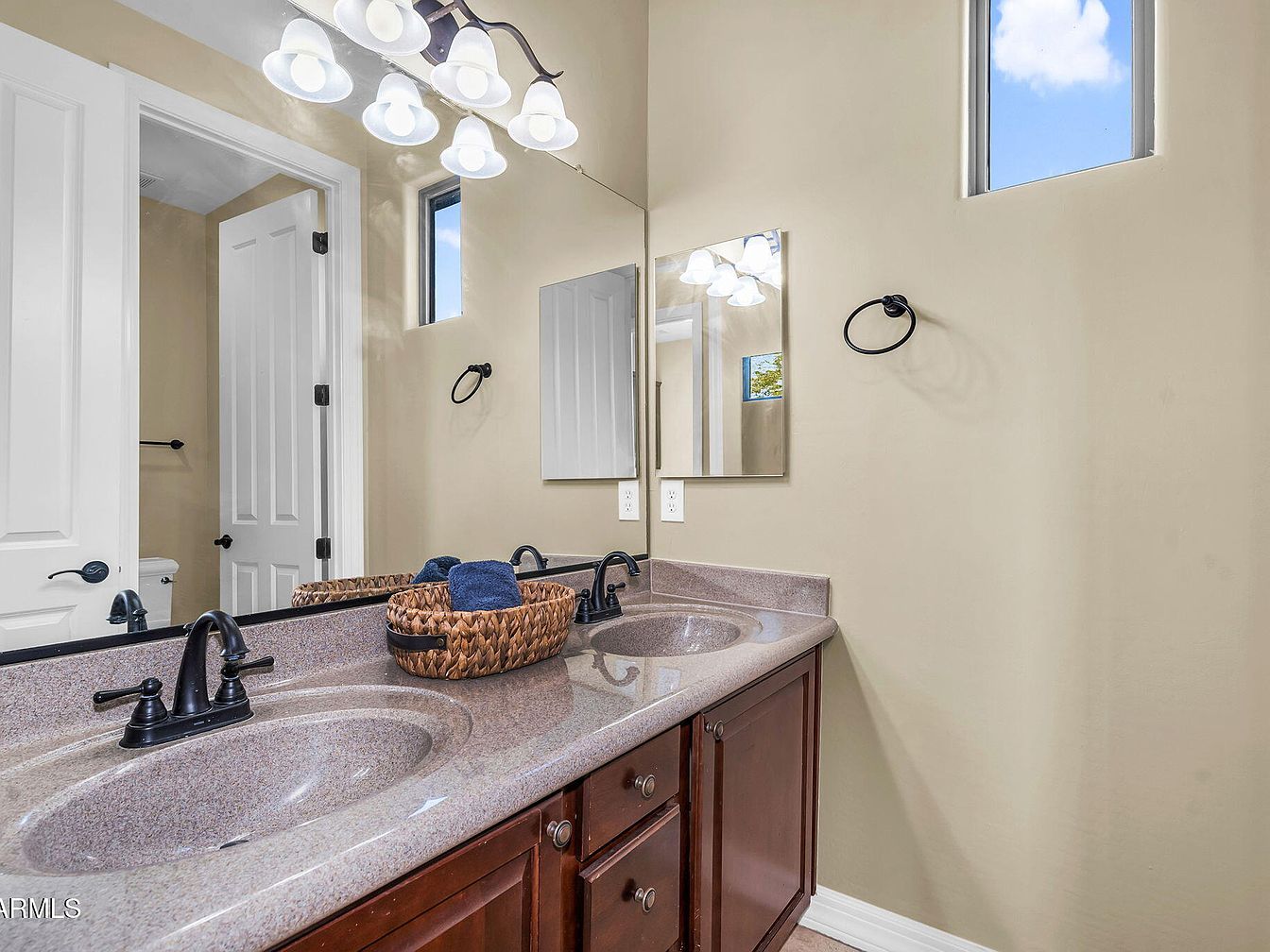 This bathroom features a double-sink vanity with smooth, granite-like countertops in soft beige tones, complemented by dark bronze faucets. The cabinetry is a rich, warm cherry wood with classic round knobs, adding an elegant contrast to the neutral walls painted in a light beige shade. Above the sinks, a large mirror spans the vanity’s width, reflecting ample light from the five-light fixture with frosted glass shades. Two small rectangular windows bring natural daylight, enhancing the bright and airy atmosphere. Black metal towel rings and hardware punctuate the design with a subtle modern touch.