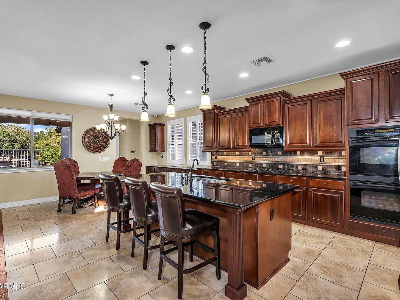 This spacious kitchen features a large central island with a glossy black granite countertop, complemented by three high-backed leather bar stools with rich dark brown tones. The cabinetry throughout the room is made from warm, dark wood, providing a classic and elegant look. Above the island, three pendant lights with wrought iron curlicue details add a decorative and functional touch. The backsplash combines mosaic tiles in shades of brown and beige for texture and warmth. Adjacent to the kitchen, a cozy dining nook is furnished with ornate red upholstered chairs and a round wood table under a traditional chandelier. Neutral beige walls and large windows with white plantation shutters bring in natural light, enhancing the inviting ambiance. The beige tiled floor ties the space together with a soft, earthy foundation.