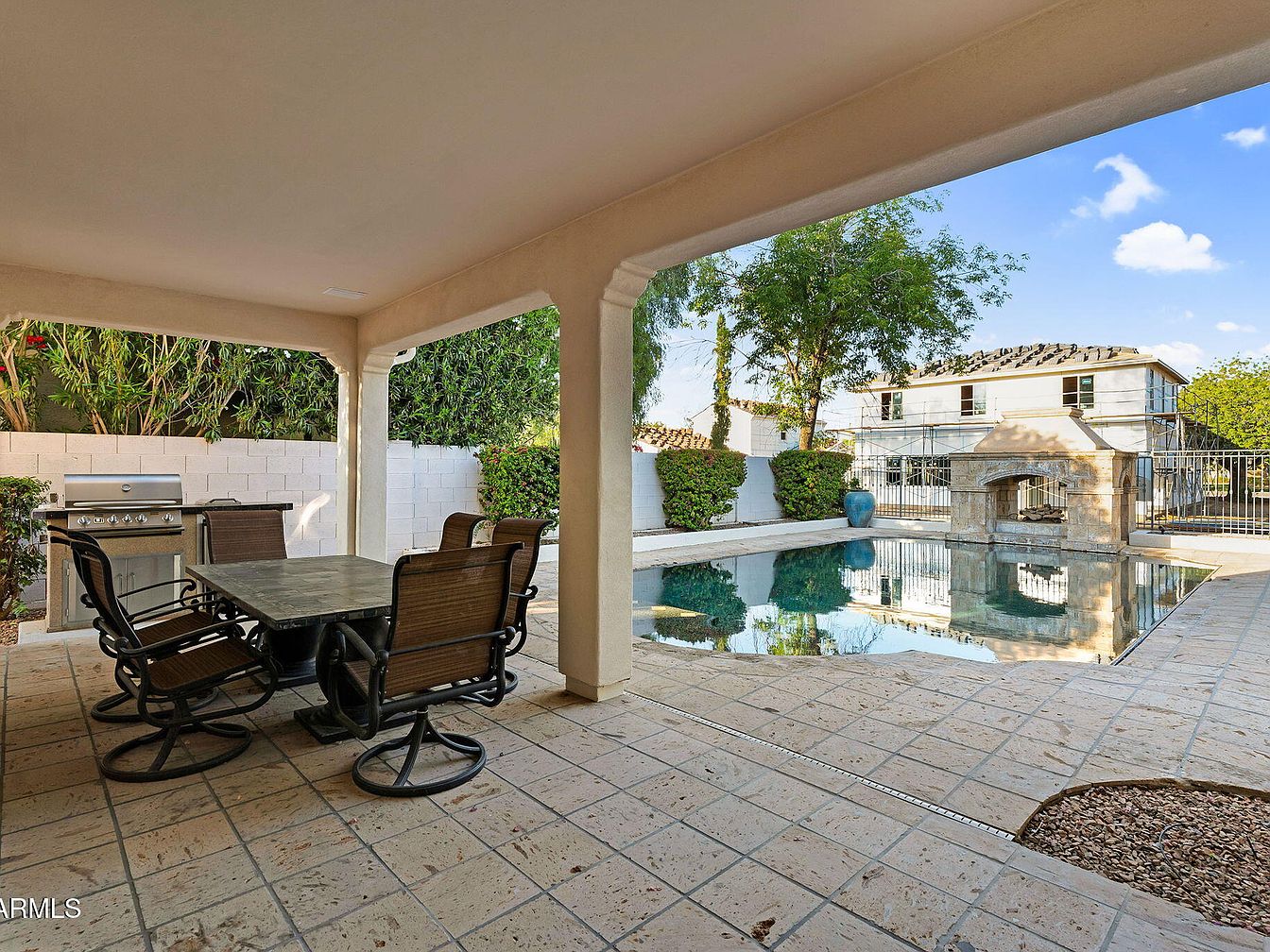 This outdoor living space features a spacious covered patio with a tiled floor in a warm beige tone that seamlessly extends to the pool deck. The patio includes a sturdy dining set with six swivel chairs surrounding a large stone or tile tabletop, positioned next to a sleek stainless steel barbecue grill, perfect for outdoor cooking and entertaining. Beyond the patio, a rectangular swimming pool reflects the sky and surrounding trees, creating a tranquil ambiance. A stone fireplace or firepit structure stands at one end of the pool, adding both charm and functionality. White block walls and trimmed greenery enclose the space, ensuring privacy and a neat aesthetic.
