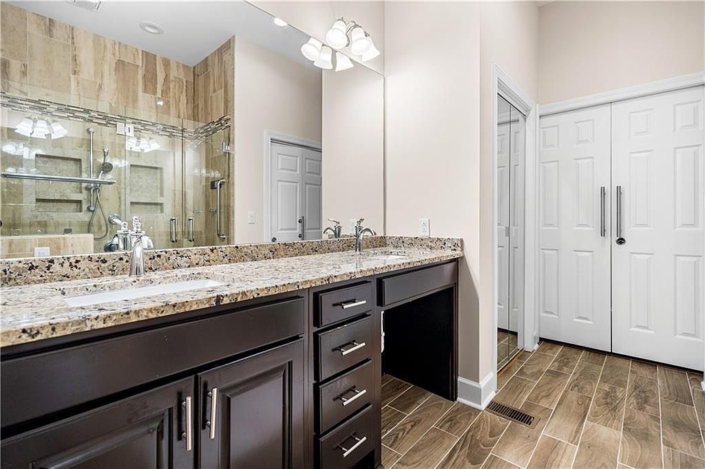 This spacious master bathroom features a long double vanity with a speckled granite countertop. The vanity cabinets are a rich dark wood, contrasting nicely with the soft beige walls. Polished silver hardware adds a modern touch to the cabinetry. Above the vanity, a large mirror stretches across the wall, reflecting light and enhancing the room’s brightness. The flooring resembles wood-look tiles in warm brown tones, extending into the adjacent walk-in shower. The shower area features beige and tan tiles with a decorative horizontal accent strip, equipped with multiple shower heads for comfort and style.