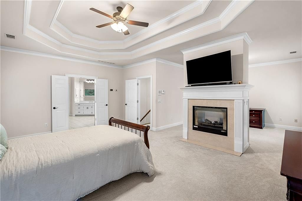 This spacious master bedroom features a neutral color palette dominated by soft beige walls and matching carpet, creating a warm, inviting atmosphere. The centerpiece is a modern dual-sided fireplace with a flat-screen TV mounted above, serving as a focal point visible from multiple angles. The room showcases an elegant tray ceiling with crown molding, highlighting architectural sophistication. White French doors open to the adjoining bathroom, enhancing the open layout. Classic wooden furniture with a dark finish including a sleigh bed and dresser contrasts tastefully with the light tones, combining comfort and style seamlessly.