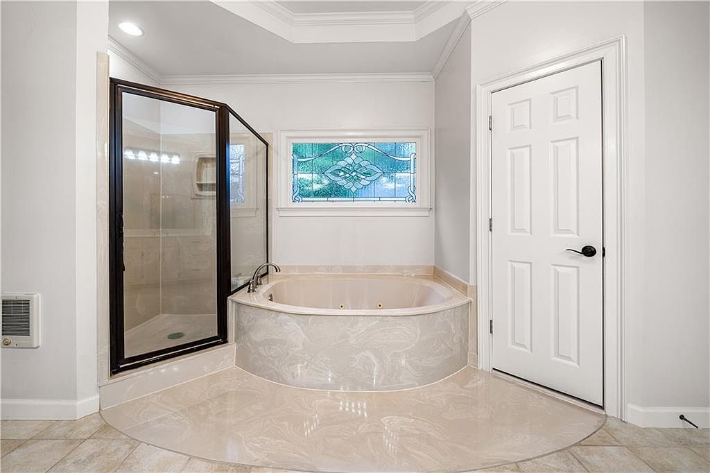 This master bathroom corner highlights a large soaking tub with a marble-patterned surround that extends seamlessly onto the floor in a soft, swirling design. Adjacent to the tub is a glass-enclosed shower framed in dark metal, adding a modern contrast to the light, neutral palette. The walls are painted a calming light gray, while a window above the tub features decorative stained glass, allowing natural light to filter through with privacy. White trim and a paneled door with a matte black handle complete the elegant and serene environment.
