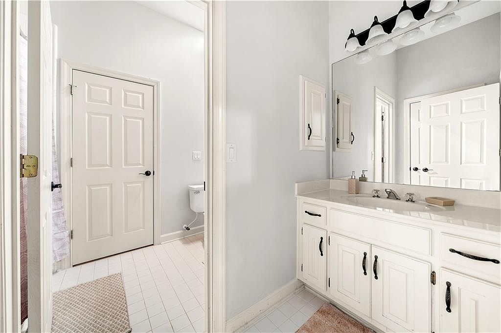 This bathroom features a clean and bright design with soft, neutral tones dominating the space. The white cabinetry below the wide countertop offers ample storage with black hardware adding subtle contrast. A large mirror extends the width of the vanity, topped with a row of classic black and white light fixtures providing ample illumination. The walls are painted a soft gray, complementing the pristine white tiled floor. Adjacent to the vanity, a doorway reveals a small alcove housing the toilet. The overall layout is functional and open, emphasizing simplicity and light-filled ambiance.