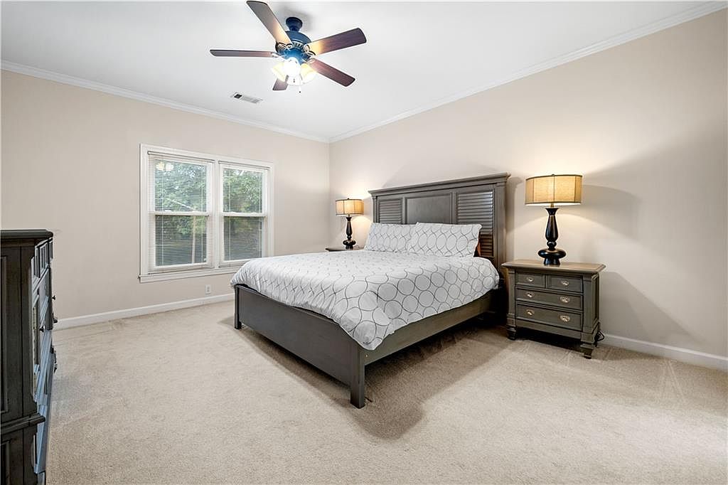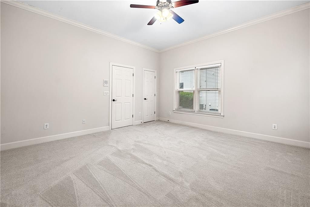 This spacious bedroom features a neutral color palette with soft beige walls and plush, light-colored carpeting that adds warmth and comfort. Crown molding accents the ceiling, lending a refined architectural detail to the room. Natural light filters in through a double window fitted with white blinds, brightening the space. Two white paneled doors with dark hardware provide access to a closet and possibly an adjoining bathroom or hallway. A ceiling fan with a built-in light fixture hangs at the center, offering both illumination and ventilation. The minimalist design invites personalization while maintaining an airy, clean ambiance.